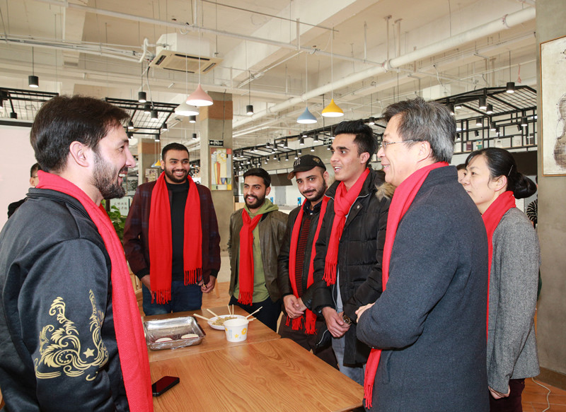 在新的一年到来之际,为切实关怀寒假期间我校留校留学生,了解他们的生活和学习情况,使其度过一个和谐、健康、快乐的春节。1月20日上午,副校长徐守坤来到武进校区一食堂二楼看望并慰问了寒假留校留学生。国际处、海外教育学院、保卫处、后管处、西太湖校区管委会、后勤产业集团、相关学院等部门负责人,留学生管理人员陪同参加了此次慰问活动。