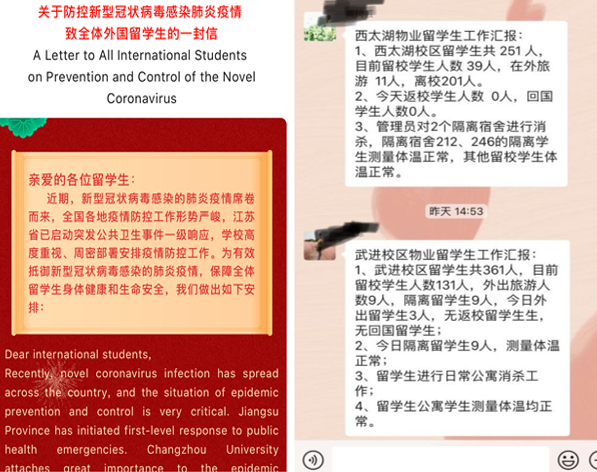 国际交流处、海外教育学院在学校疫情防控工作领导小组统一部署下,第一时间成立留学生疫情防控工作小组,结合学校留学生的实际情况,制定出台了《常州大学留学生疫情防控工作管理专项预案》,发布了《进一步加强常州大学留学生疫情防控工作的通知》。同时,第一时间全面细致地排查在校留学生和外出旅游访友留学生情况,确认在外旅游访友学生所在位置,执行24小时行程动向跟踪。