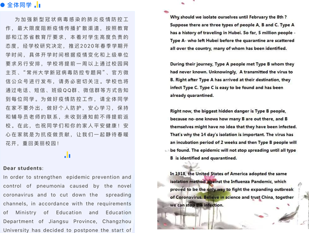 新型冠状病毒肺炎疫情发生以来,面对寒假253名留校留学生群体的疫情防控工作,常州大学认真贯彻习近平总书记的重要指示精神和党中央的各项决策部署,统一指挥,统一行动,落实关键举措,细化责任分工,强化协同联动,积极做好疫情防控工作,切实守护来华留学生的生命健康安全。