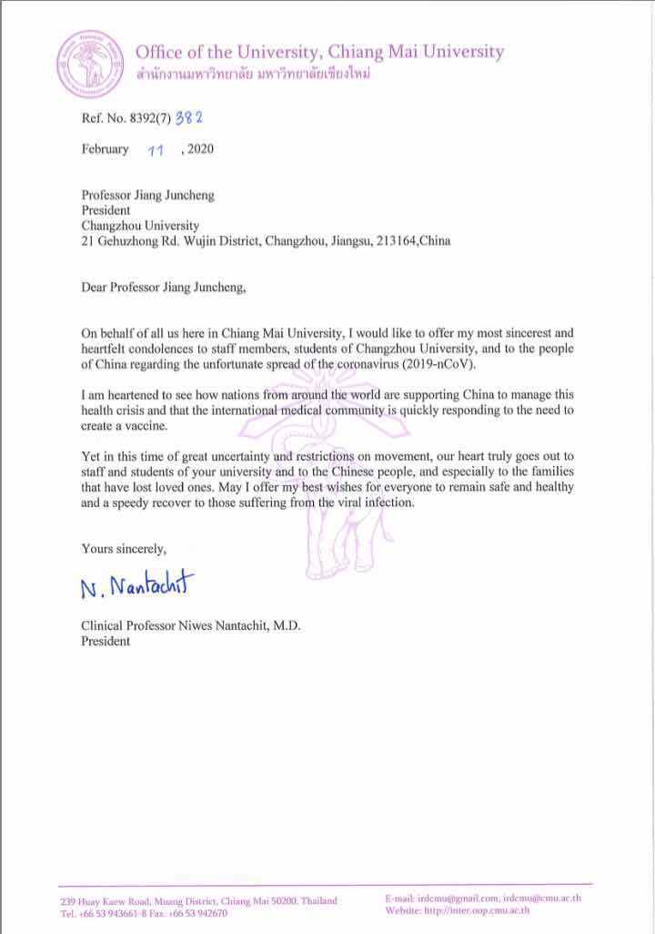 泰国清迈大学校长Niwes Nantachit致函,对我校师生表达慰问,对疫情给全国人民造成的不幸表示同情,对在疫情中痛失家人的中国家庭表示哀悼。包括泰国在内的世界各国全力支持中国积极应对此次疫情,并致力于疫苗研发。衷心祝愿疫情早日得到控制,中国人民平安健康。