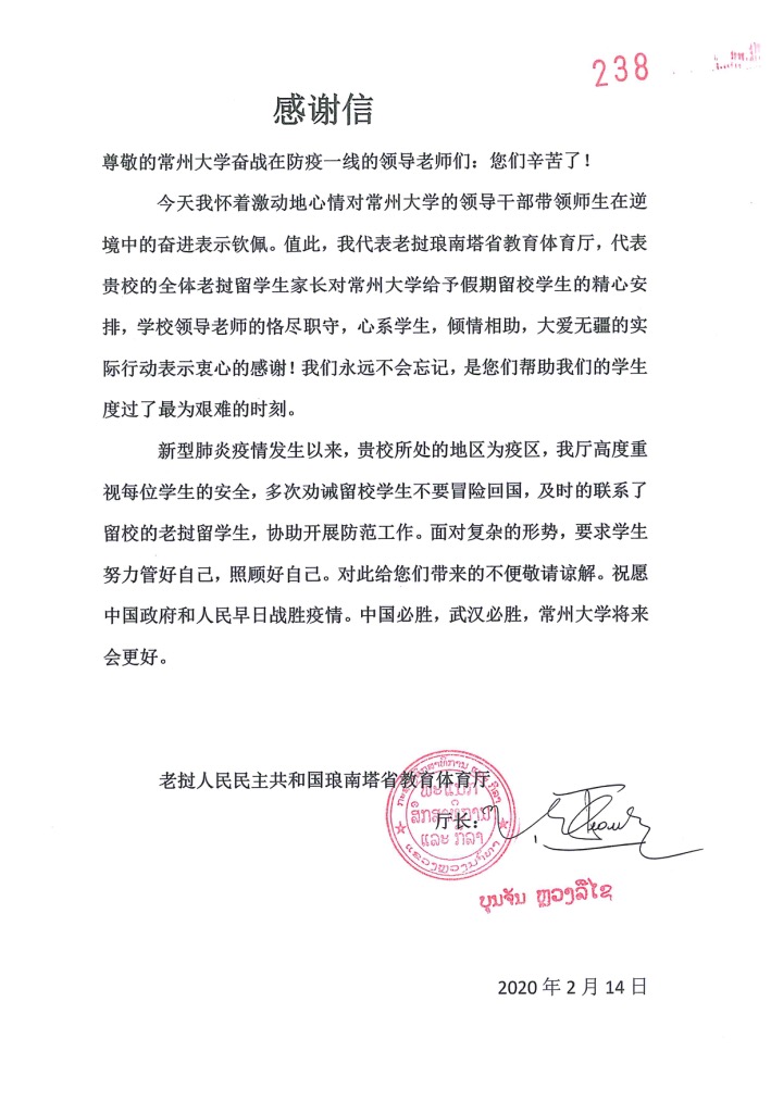 老挝琅南塔省教育体育厅厅长发来感谢信,面对复杂的疫情形势,我校领导干部带领师生在逆境中奋进,积极开展留校留学生的生活安排和防范工作,关心每一位留校老挝留学生的日常生活。祝愿中国早日战胜疫情,常州大学将来会更好。
