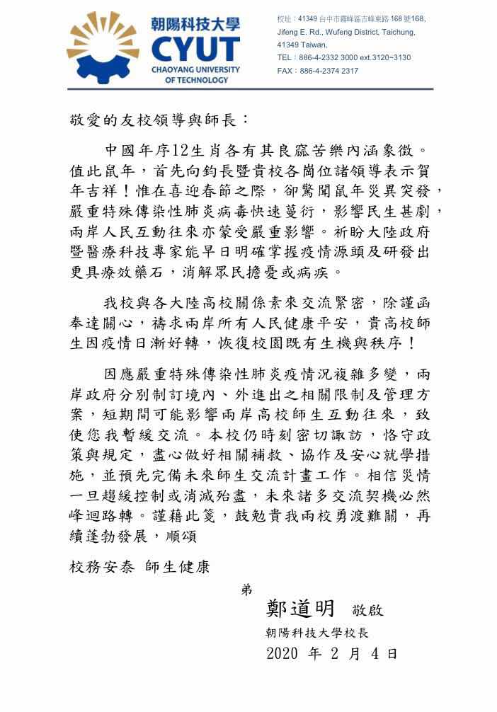 台湾朝阳科技大学校长郑道明来函表示,两岸人民都在遭受疫情困扰,期盼两校师生共同努力,早日消除疫情,尽快恢复充满生机和活力的美好校园生活,期待两校开展交流与合作。