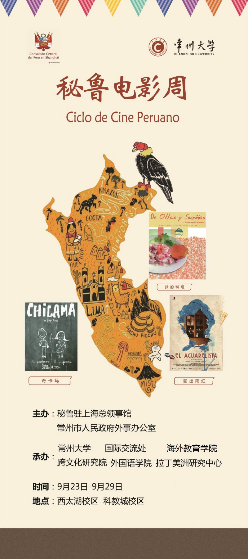 “秘鲁电影周”是为庆祝即将到来的中秘建交40周年、推动两国文化交流,由秘鲁驻上海总领事管和常州市人民政府外事办公室联合主办、常州大学国际交流处、海外教育学院、跨文化研究院、外国语学院和拉丁美洲研究中心承办的活动。“秘鲁电影周”系列活动包含学术讲座、秘鲁电影放映和影评比赛等,预计将于10月下旬结束。