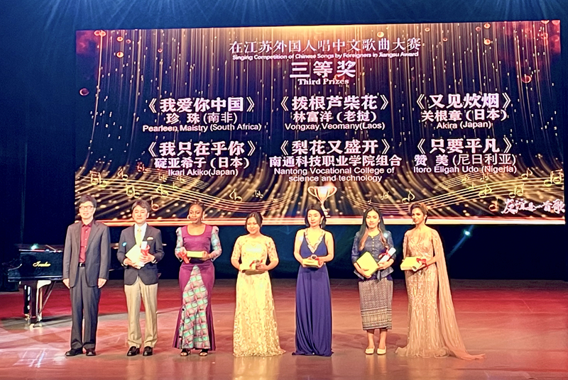 5月7日—8日,由江苏省人民对外友好协会、江苏省文学艺术界联合会主办,省友协办公室、省音协承办的“友谊是一首歌”——在江苏外国人唱中文歌曲大赛决赛和颁奖音乐会在南京举行。我校音乐与影视学院崔倡老师指导,老挝籍留学生VONGXAY VEOMANY演唱的江苏民歌《拔根芦柴花》荣获三等奖,并在颁奖音乐会上进行展演。副省长惠建林,省政协副主席、党组副书记阎立到会并为获奖者颁奖。