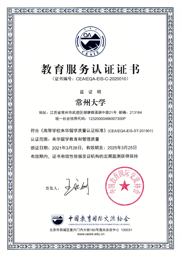 近日,由教育部委托中国教育国际交流协会作为第三方评价机构组织实施的2020年度全国高等学校来华留学质量认证结果发布,常州大学顺利通过认证,有效期四年。