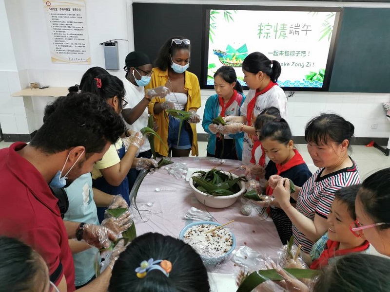 活动中,中外师生共同观看了介绍端午节文化的视频,了解了端午节由来,学习了“赛龙舟”、“包粽子”等端午传统习俗的文化内涵。视频结束后的端午节文化知识竞赛场面十分热烈。来自学校后勤服务中心的老师进行了现场讲解并手把手教中外师生卷粽叶、放白米、加馅料、系扎带。师生们相互帮助,现场欢声笑语,其乐融融。包完后,中外师生们纷纷跟自己的作品合影留念。来自老挝的留学生VONGXAY VEOMANY(林富洋)同学已经是第二次参加端午节包粽子活动了,她表示:“与往年相比,今年的活动因为小朋友们的加入多了很多乐趣。小朋友们都很聪明,包的比哥哥姐姐们还要好。在彼此帮助的过程中,我感觉自己与中国朋友更加亲近了。”