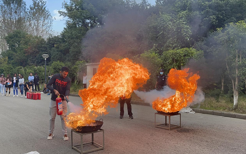 在消防演练中,我校消防专业人员为留学生普及了消防知识,细致地讲解了灭火器的使用方法、示范了动作要领。留学生们分别使用灭火器在人工模拟的安全场景中对火源进行扑救,保卫处老师们对留学生的操作进行了现场指导和纠正,有效提升了大家的火灾防控和火灾应急处置能力。
