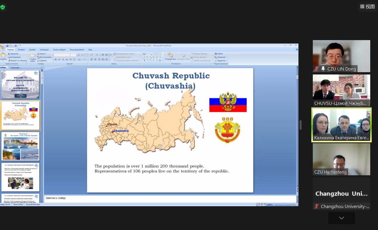 4月11日,常州大学国际交流处与俄罗斯楚瓦什国立大学通过视频会议的形式就两校开展合作进行了会谈。楚瓦什国立大学国际处主任叶夫根尼•尼古拉耶夫、国际项目和学术部门负责人卡林尼娜•叶夫根尼耶夫娜,我校国际交流处处长何岩峰、跨文化研究院副院长杜志峰、国际交流处副处长王宁等参加会议,会议由何岩峰主持。