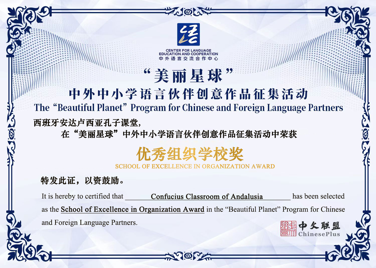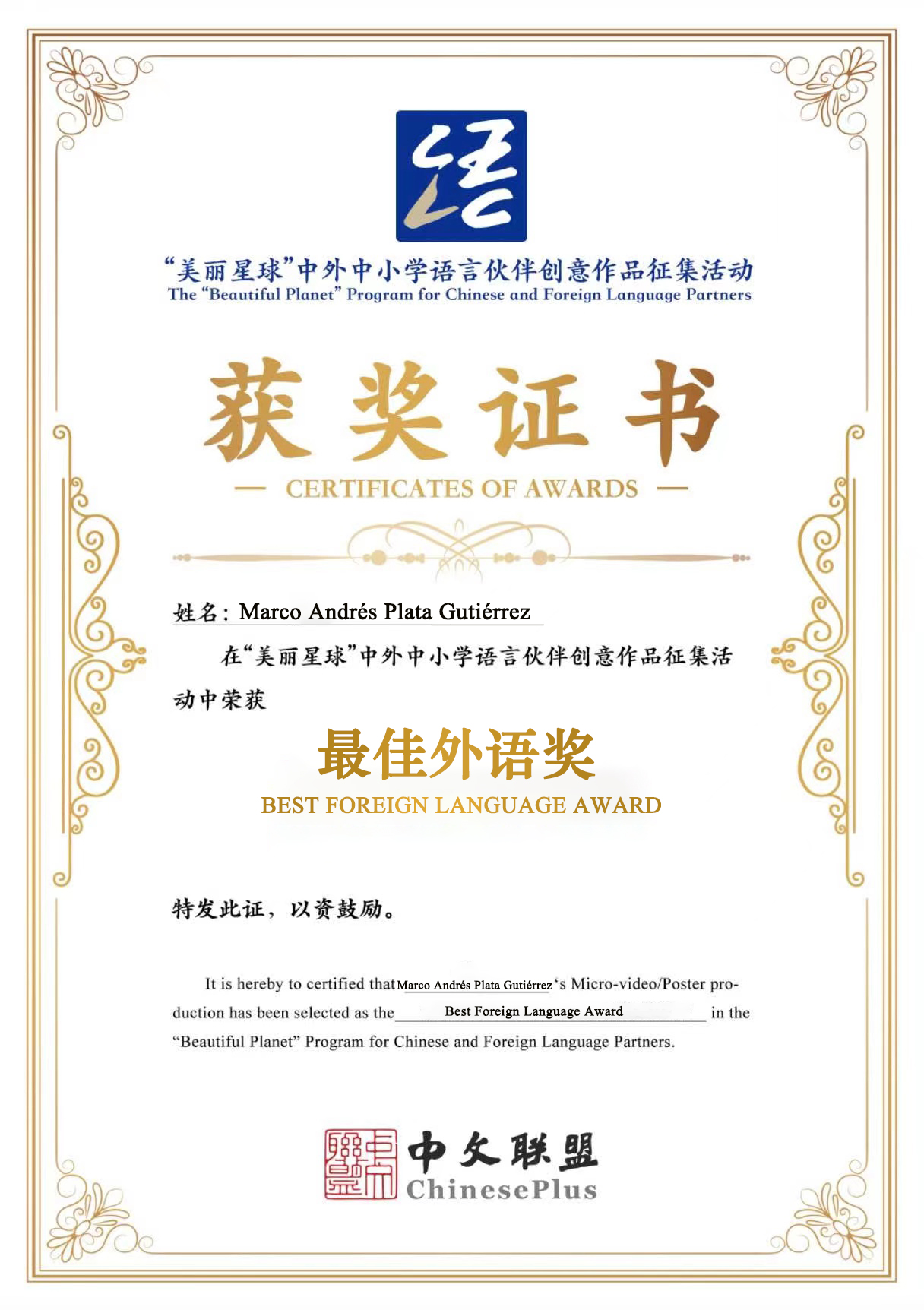 近日,由中外语言交流合作中心(以下简称语合中心)发起的“美丽星球”中外中小学语言伙伴创意作品征集活动圆满结束。在来自47个国家222所学校的1800份投稿中,我校西班牙安达卢西亚孔子课堂学生Marco Andrés Plata Gutiérrez荣获最佳外语奖,安达卢西亚大区孔子课堂荣获优秀组织学校奖。