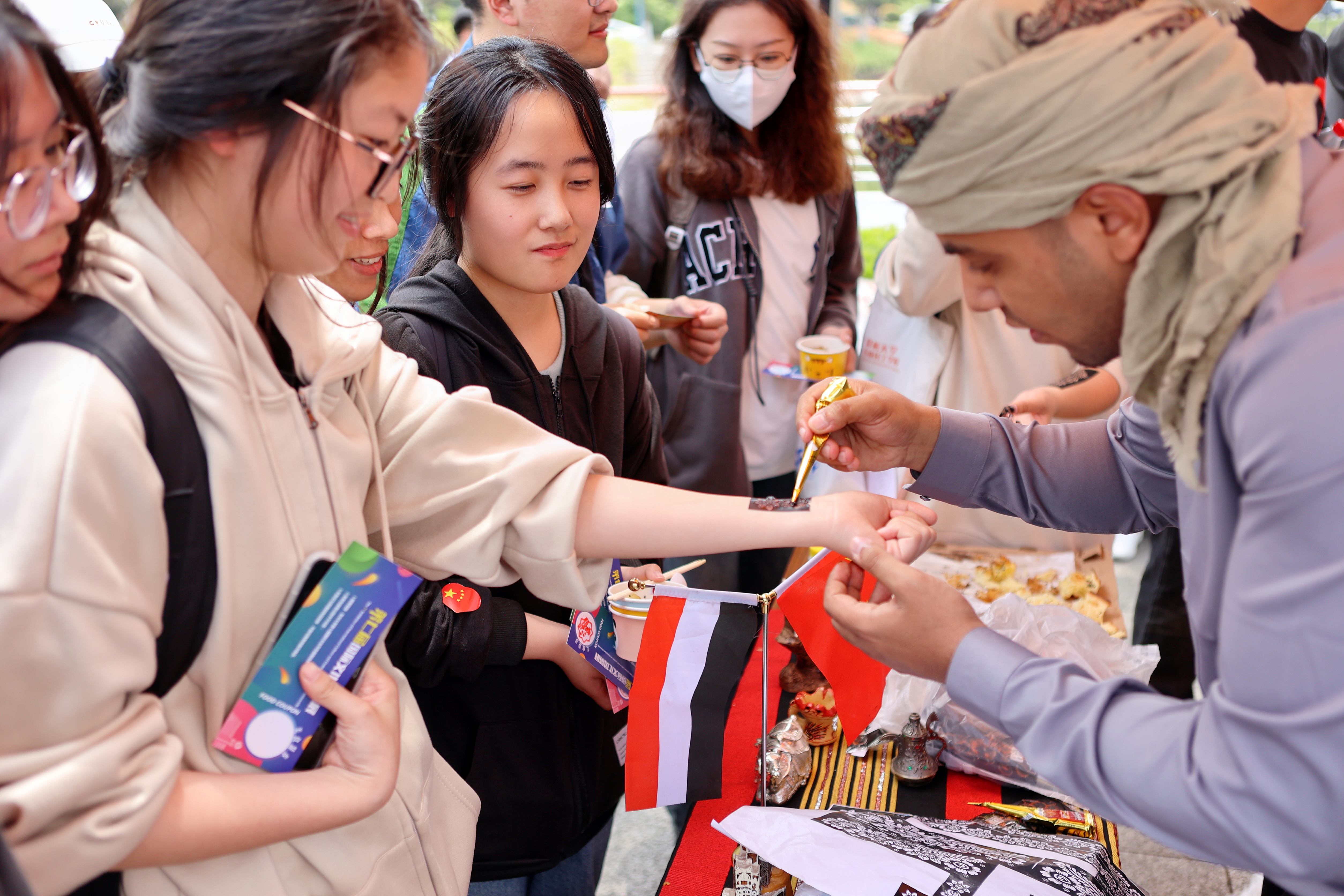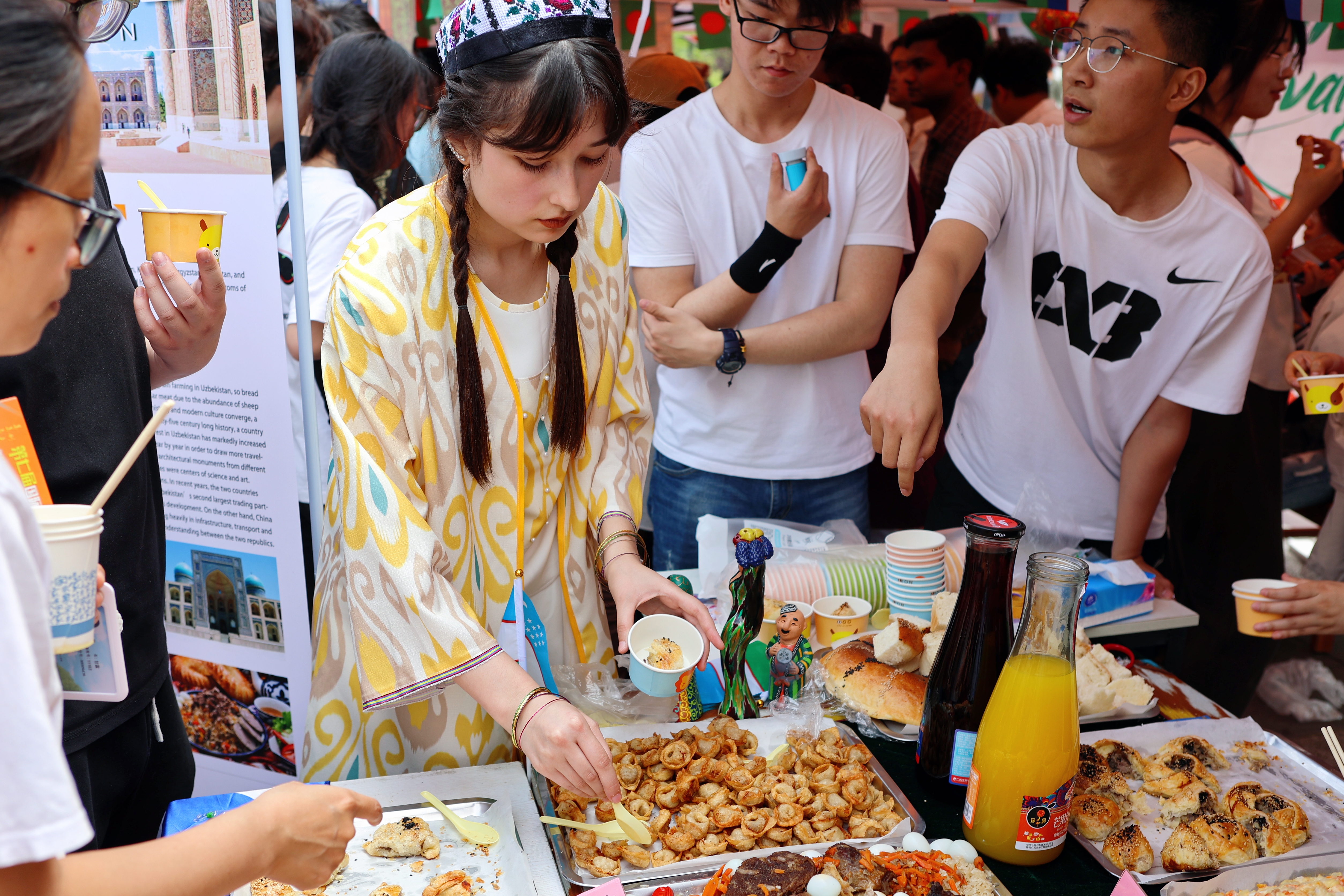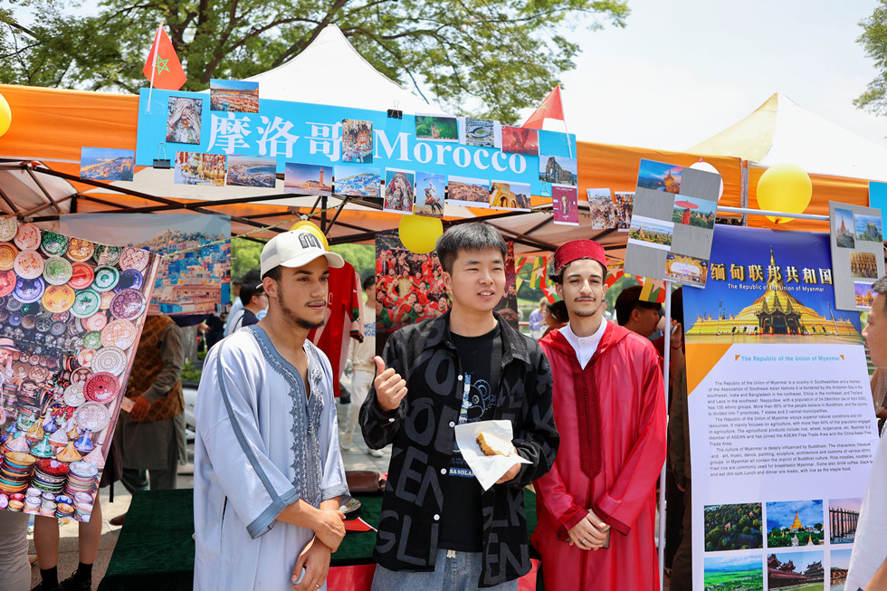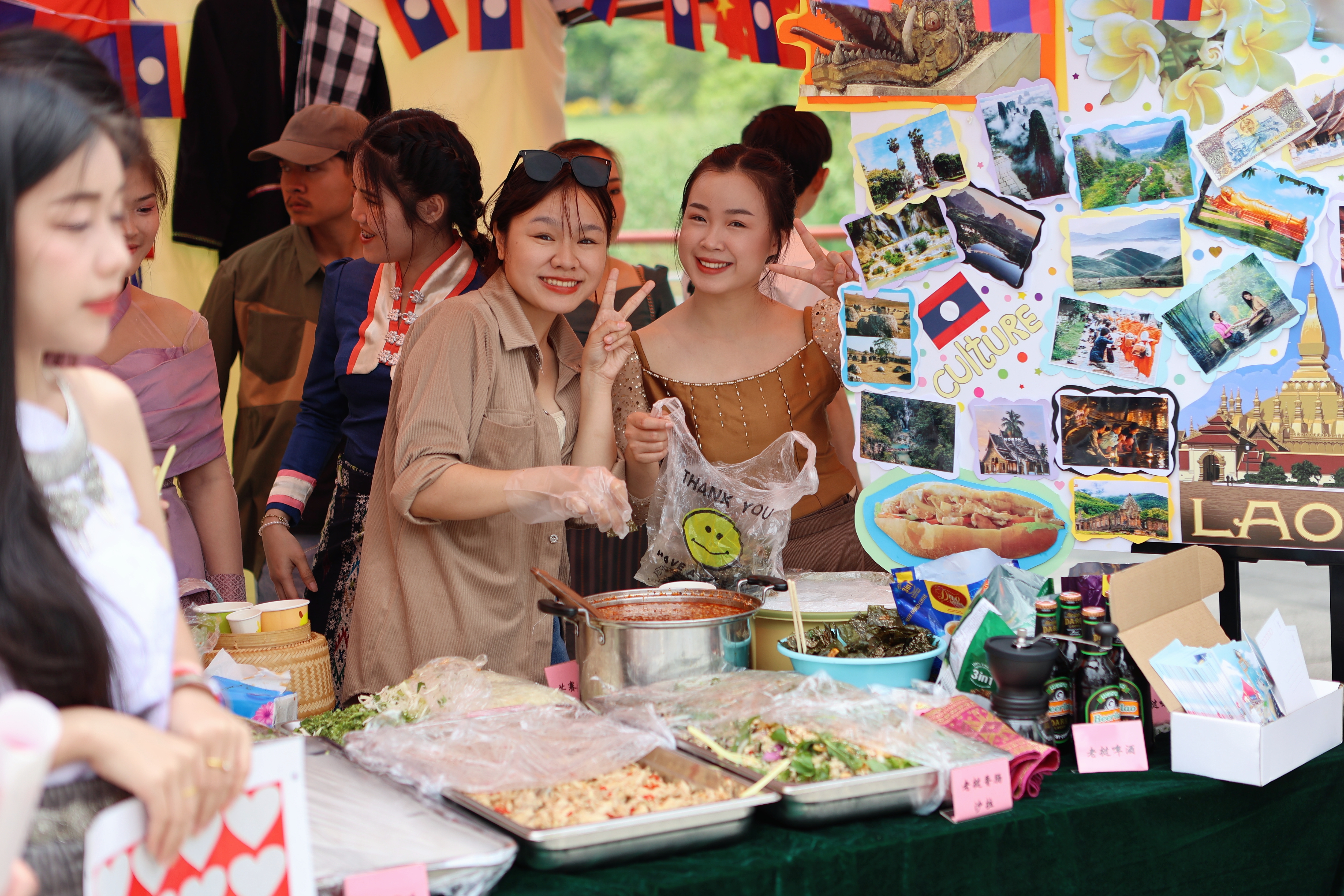 开幕式结束后,师生们共同参观了国际文化风情展。外国留学生身着本国传统服饰,通过精心准备的传统文化海报、工艺品、照片、明信片、手工挂件、互动体验游戏等,向中国师生热情展示自己国家的特色文化风情,免费提供亲手制作的传统美食。泰国芒果糯米饭,清新爽口,好评不断;老挝炸春卷色泽金黄,香气袭人;孟加拉国的咖喱饭爽滑酥嫩,令人垂涎欲滴;埃塞俄比亚耶加雪菲咖啡散发着独特的甜香气,口感清新明亮;毛里求斯和尼日利亚的非洲鼓舞热情奔放,赢得了观众们的阵阵掌声;巴基斯坦留学生摊位前民族舞蹈全程未断,鲜明地展示了该国热情洋溢的民族舞蹈风情,现场师生纷纷加入;大麻糕、萝卜干、梳篦、溧阳白茶等常州特产也让留学生们倍感新鲜。本次文化节设置了师生投票墙,五彩缤纷的投票贴纸也在给留学生们加油鼓劲,增加了中外师生的互动交流。