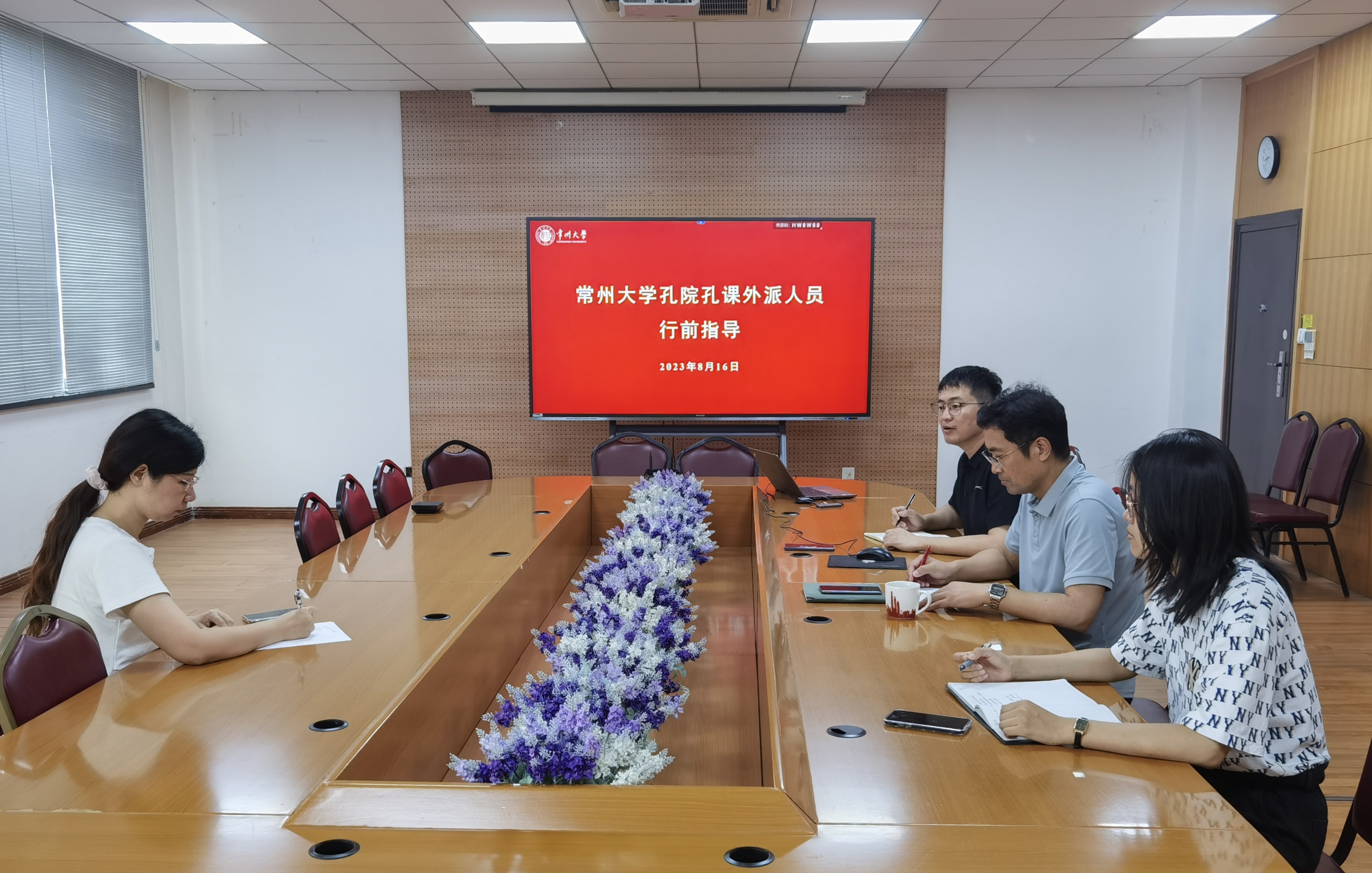 8⽉16⽇,我校开展常州⼤学孔院孔课外派⼈员⾏前指导⼯作会议。跨⽂化研究院院⻓、国际交流处副处⻓杜志峰,国际交流处副处⻓嵇炜,常州⼤学玻利瓦尔⼤学孔⼦学院中⽅院⻓陈珊和四位外派教师志愿者参加会议。⾏前指导⼯作会议由国际处华⽂教育科苏柯⾬主持。