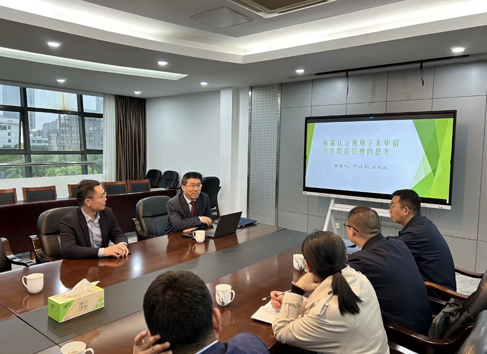 栾凤池以《质量认证视角下来华留学生教育管理的思考》为题,分“来华留学高等教育质量认证指标体系的学习与分享”“对来华留学高等教育质量认证的思考”“实践分享”“实现目标”四个章节,作认证工作指导报告。