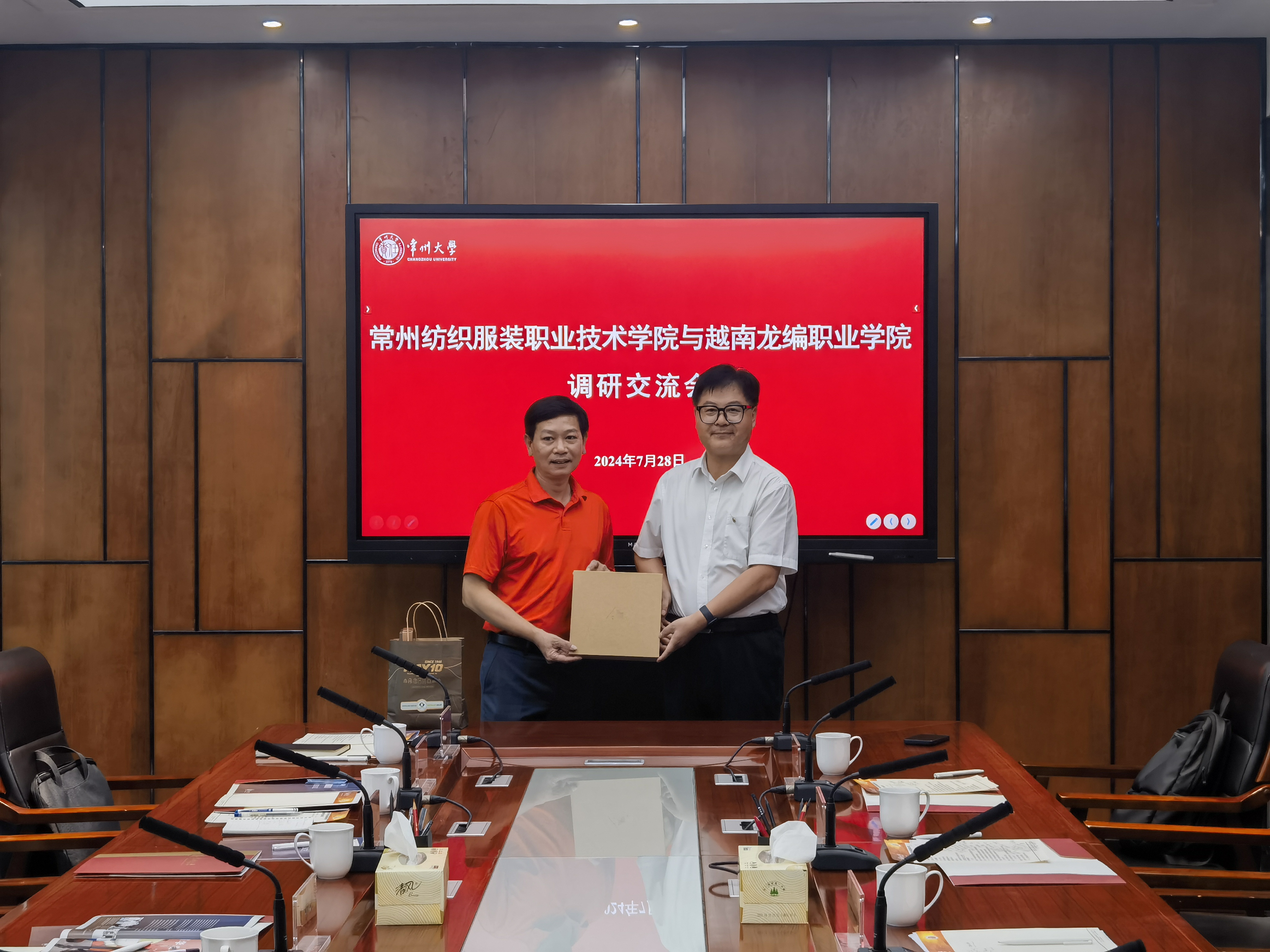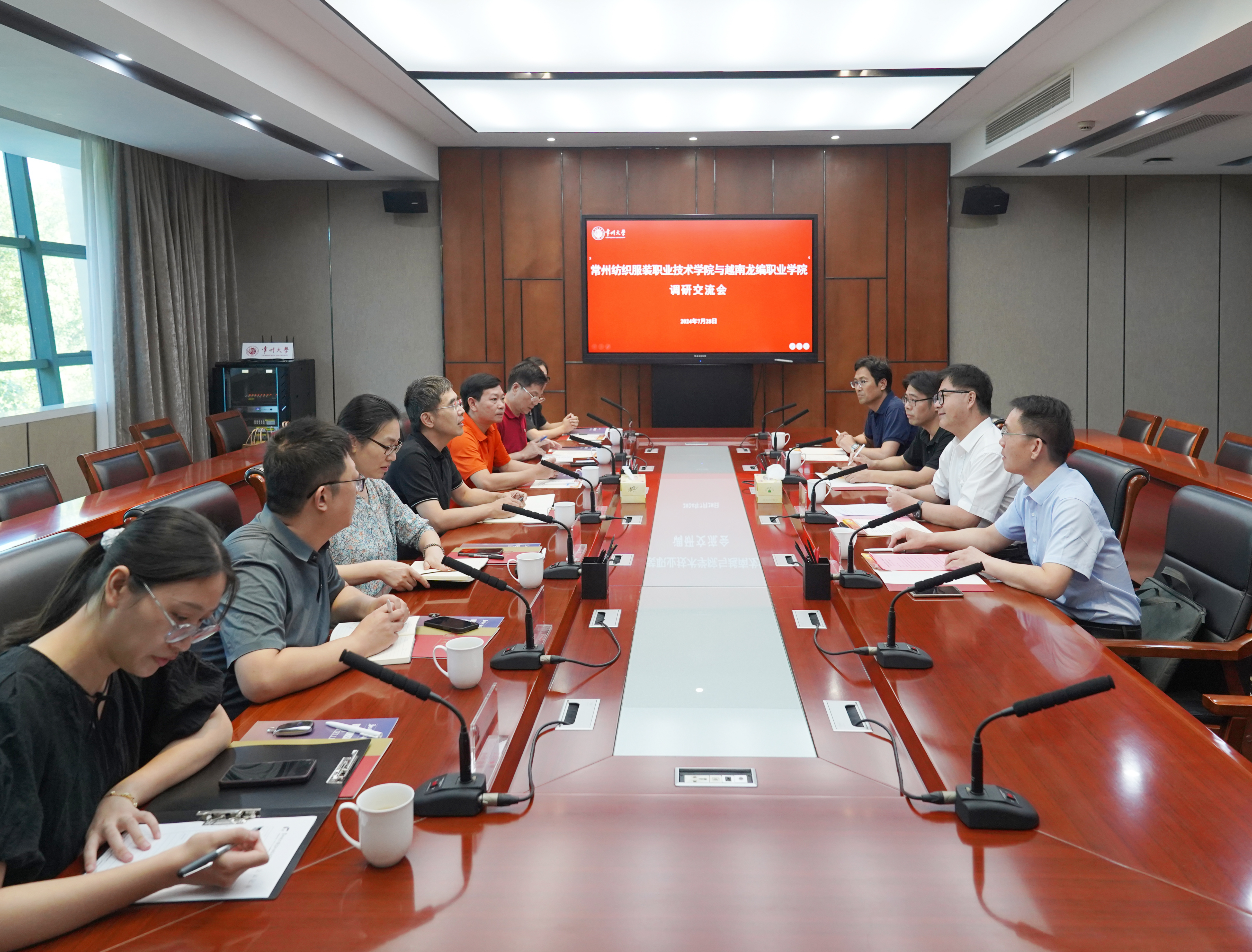 7月28日上午,常州纺织服装职业技术学院副校长张震宇与越南龙编职业学院校长阮越河一行来校交流。党委常委、副校长李忠玉出席会议,国际交流处、周有光文学院、跨文化研究院负责人参加交流活动。