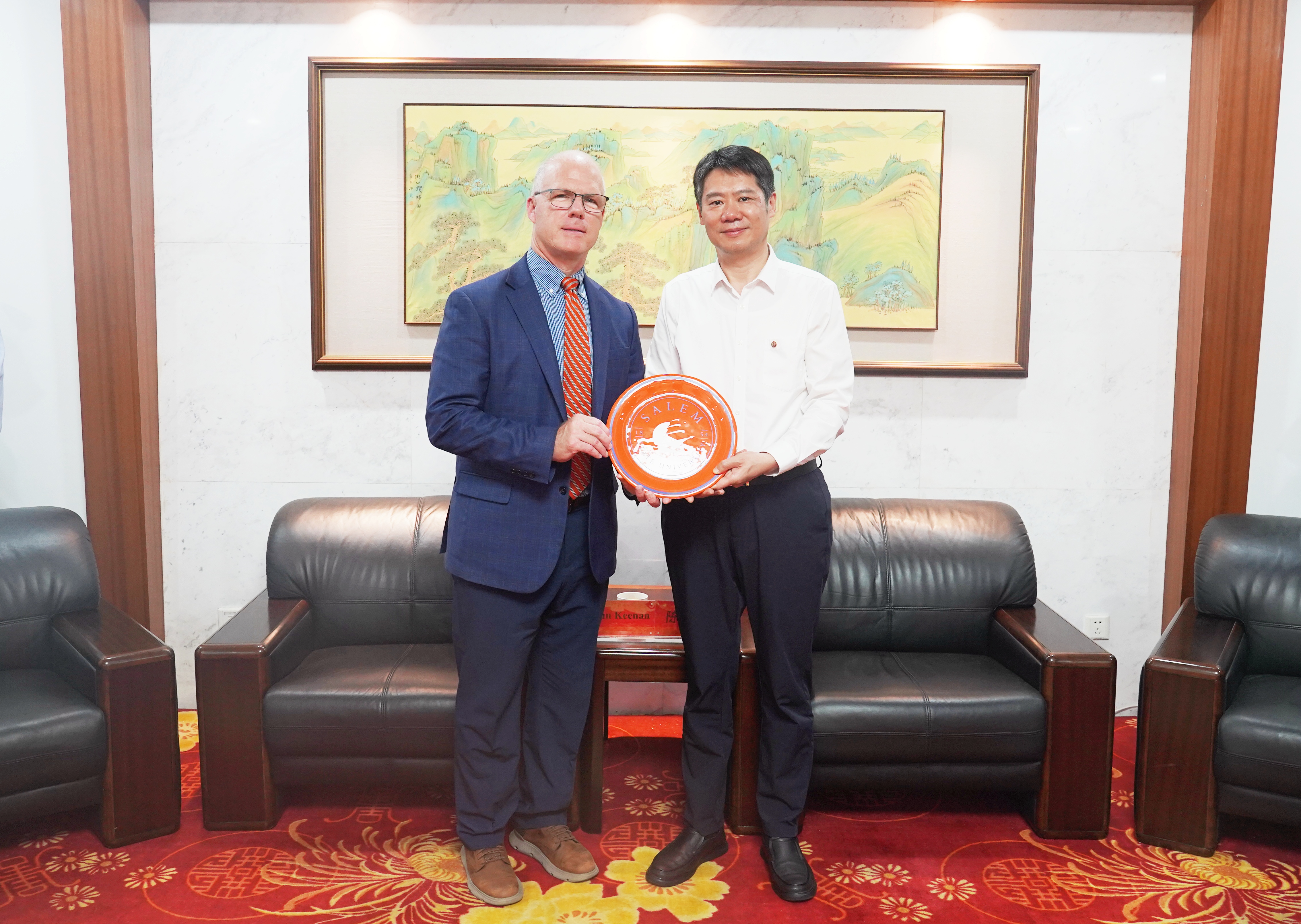 6月18日,美国塞勒姆州立大学校长约翰·基南一行来访我校,党委副书记,校长陈海群、副校长王建浦在科教城校区文正楼贵宾室会见了外宾,国际交流处、商学院相关负责人陪同会见。