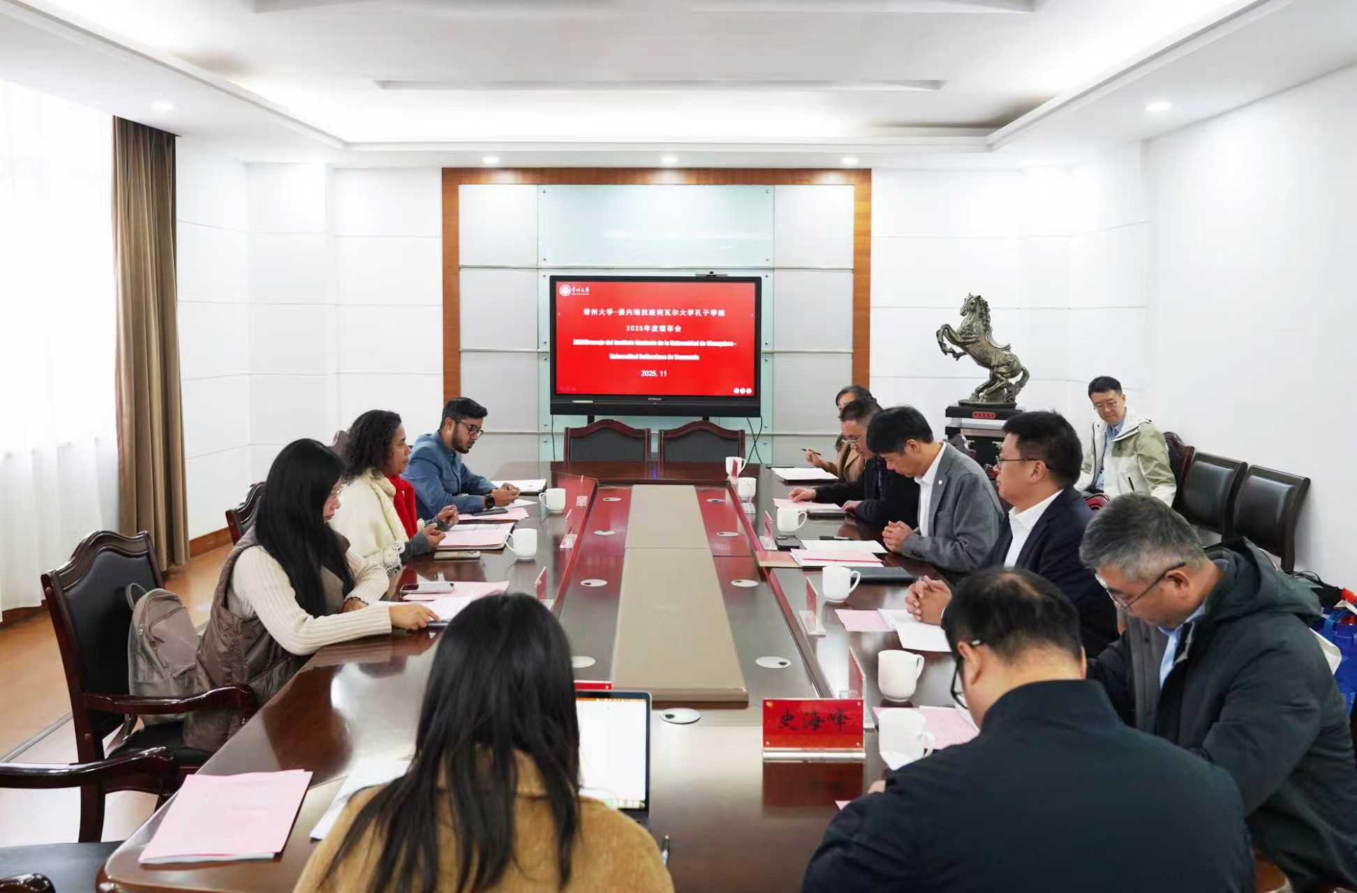 11月17日,委内瑞拉玻利瓦尔大学孔子学院(以下简称“委内孔院”)2025年度理事会在我校召开。委内孔院理事会外方常务理事长、玻利瓦尔大学副校长詹妮弗·吉尔,外方理事、玻利瓦尔大学国际关系部主任塞萨尔•埃雷拉,中方理事长、常州大学校长陈海群,中方副理事长、副校长李亚飞,中方理事、校办主任史海峰,人事处处长孙凌峰,财务处处长周晓东,委内孔院中方院长陈珊参加会议。委内孔院中方理事、常州大学国际交流处处长魏伟主持会议。