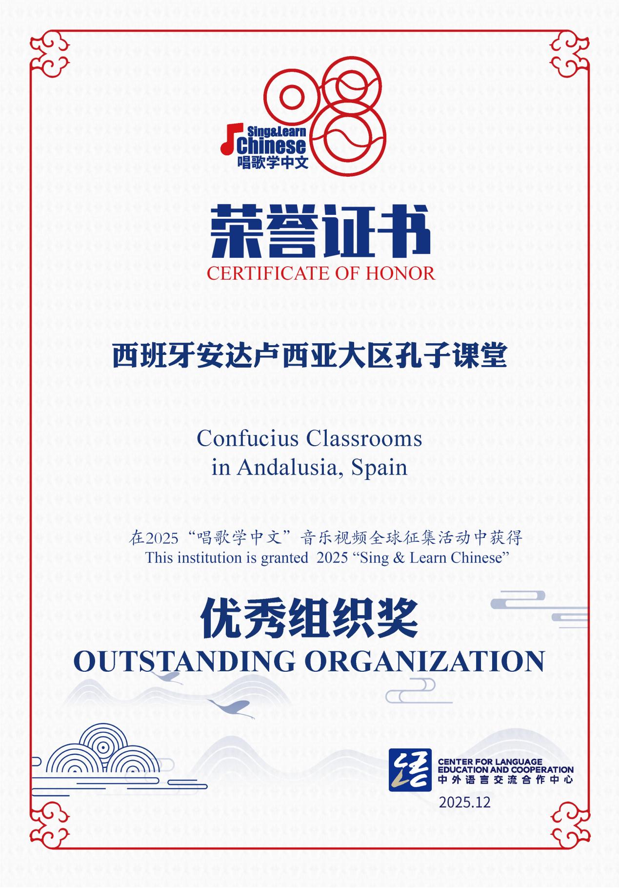 近日,2025年“唱歌学中文——与自然和鸣”音乐视频全球征集活动评选结果正式揭晓。我校西班牙安达卢西亚大区孔子课堂首次参赛便表现亮眼,成功斩获本届活动“优秀组织奖”,充分彰显了我校在国际中文教育实践与跨文化领域的综合实力。
